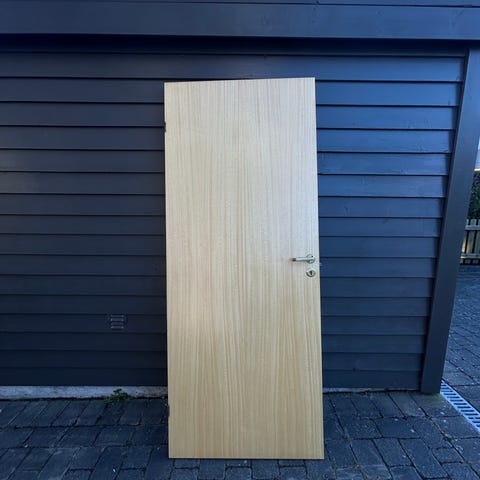 Dørene har tre rektangulære fyllinger og hull for lås og håndtak.