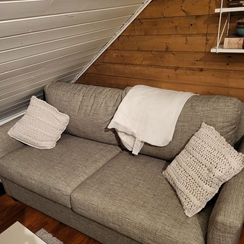 Sofaen måler utslått 140 cm x 200 cm. Overmadrass 5 cm følger med.