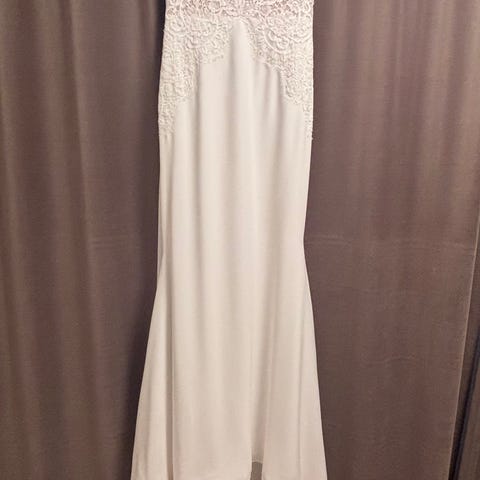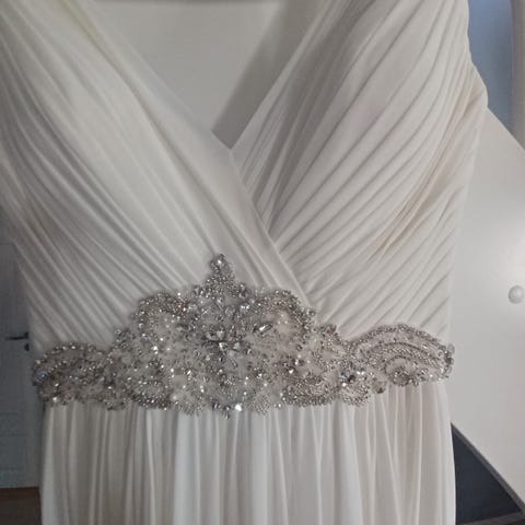 Vurderer å selge min nydelige og romantiske brudekjole fra Pronovias. Florlette ermer som er åpen fra albue og ned. Nydelig blomsterpynt rundt midjen og rundt armene. Knapper langs hele ryggen. Lite slep. Passer best til høyde 160-165 cm.