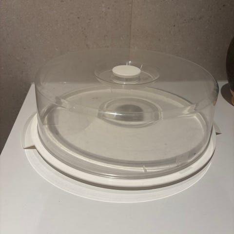 Kjekk kaketine med hank og lokk i hard plast.