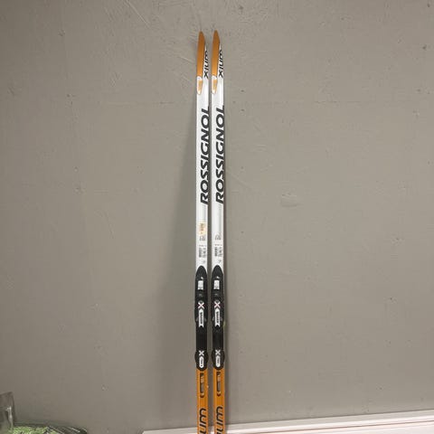 Madshus Magnum langrennsski med stålkant.Skiene har bindinger montert og er egnet for klassisk stil. De har en blå og hvit farge med røde detaljer.