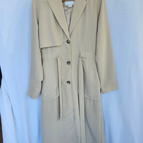 Trenchcoat i 100% lin fra H&M. Beige . Lengde til under knærne, fine knyte detaljer på ermer og knytebelte i livet. Lommer .