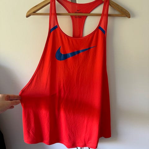 Selger den treningssinglet fra Nike i størrelse L, da den aldri blir brukt. Den har vel blitt tatt på en gang, men tatt av før den har blitt brukt til trening. Jeg foretrekker overdeler med ermer 😅 Singlet er svart og laget med Dri-FIT-teknologi, som bidrar til å transportere fuktighet bort fra kroppen. Egnet for fitness og trening. Den er avrundet bak og har litt lenger lengde bak enn foran.