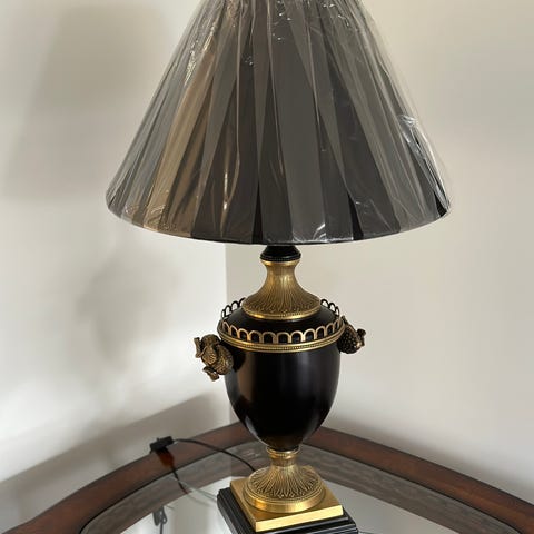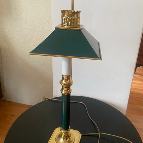 Dekorativ og robust bordlampe som løfter rommet – grønn skjerm med kant, gullfarget detaljert base og mørk fot. Pro: veldig solid, passer klassisk/interiør. Contra: kosmetiske merker på skjermen, kan byttes om du vil ha “perfekt”. Selges til riktig pris for rask handel.