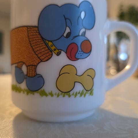 Fint retro/vintage Arcopal France krus/kopp med hank i melkeglass med motiv av dachs/hund. Kruset er fra 1970-tallet og er laget av opalinglass, et slitesterkt materiale kjent for sin hvite, ugjennomsiktige finish. Helt og pent med motiv i klare, fine farger.