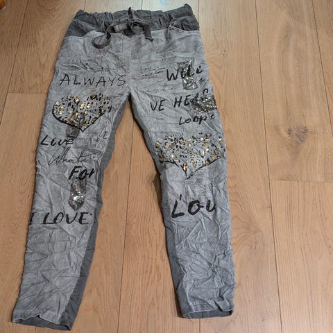 Tøff bukse med vide lår som går under kneet.råtøff med topp til.grå denim med veldig fine detaljer. Brukes som skjørt/ knebukse.ny og ubrukt.