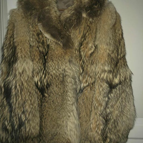 Selger min pelsvest i kaninskinn. Hetten har kant i ulveskinn. Lett og behagelig over en genser