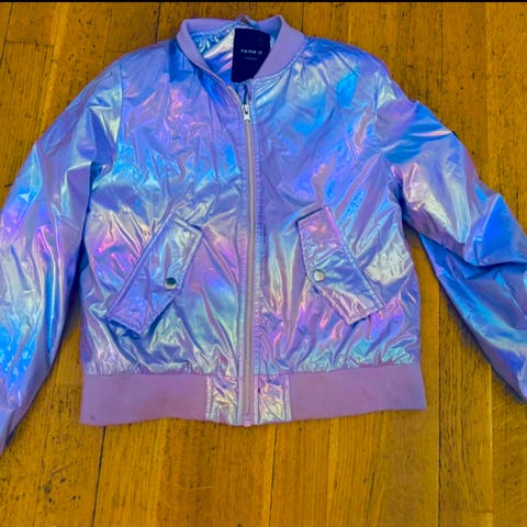 H&M jakke i størrelse 152 for jente. Jakken er rosa og har glossy finish. Den har glidelås og hette, og er designet for barn. Passer for vår, høst og milde vinterdager.