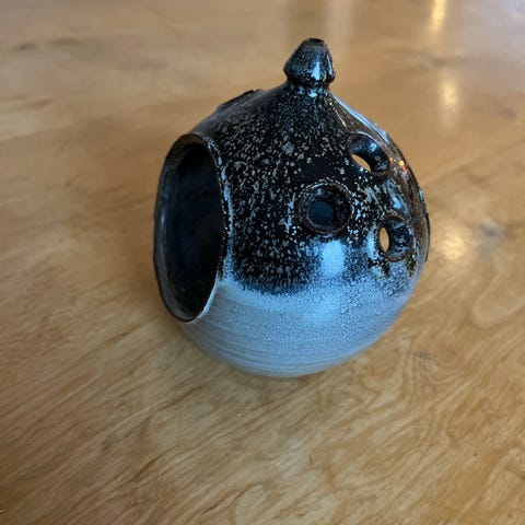 Figur laget av tre med hvit og brun farge. Figuren har et konisk design med en rund hodeform og dekorative prikker på forsiden.