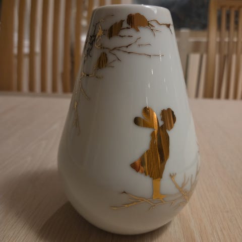 H; 27 cm uten lokk, ca 40 cm med lokk. Et lite hull til skje i lokket