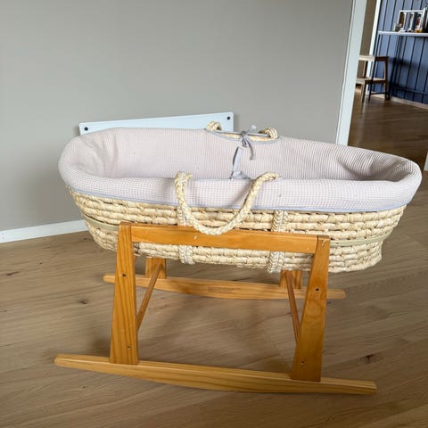 Genial med hjul slik at den kan trilles dit man ønsker. Med madrass. Vaskbart trekk.