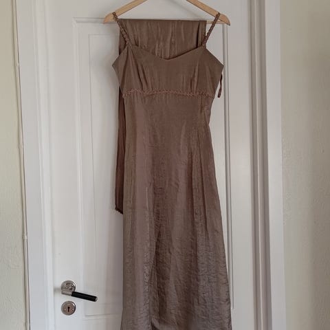 Dolce & Gabbana (? Jeg er usikker på merket - se siste bildet) kjole i brun farge, størrelse 38. Laget av kvalitetslin. Kjolen er foret med glidelås i siden. Kjolen har justerbare stropper, som kan festes i kryss og snøring bak for tilpasning. Den rekker til eller under knærne. Nydelig og spesiell sommerkjole. Brukt en gang.