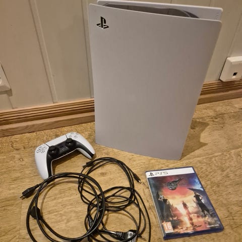 Playstation 5 slim digital edition, med trådløs kontroller.