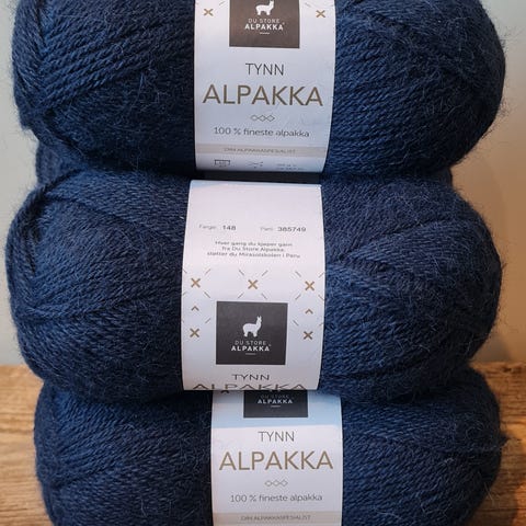 Du Store Alpakka Tynn Alpakka garn i blå farge. Hver nøste veier 50 gram og består av 100 % fineste alpakka. Garnet anbefales vasket ved 30 °C, vrenges før vask, og bør ikke tørkes i tørketrommel. Egnet for bruk i plagg som krever mykhet og varme.
