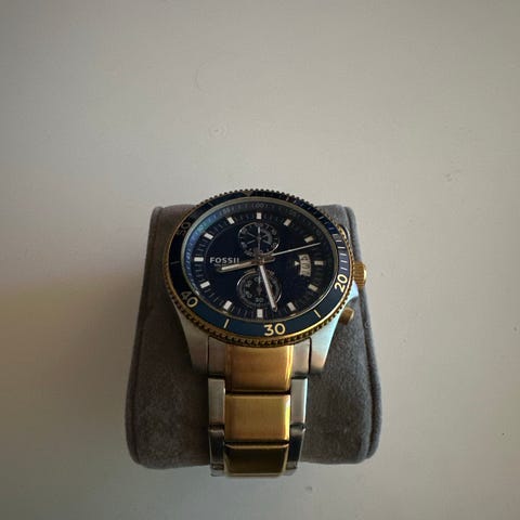 Fossil herreklokke med urkasse og lenke i stål. Klokken har en mørk urskive og analog visning. Designet for herrebruk.