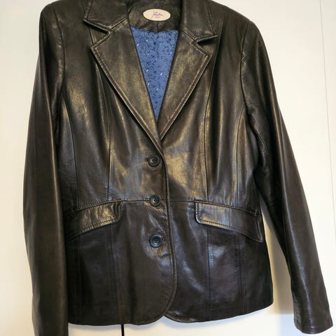 Massimo Dutti i skinn med brun farge. Jakken er i str L spansk størrelse tilsvarer str M. Den har knapper foran og lommer med klaff og knapp. God skinnkvalitet og lite brukt.