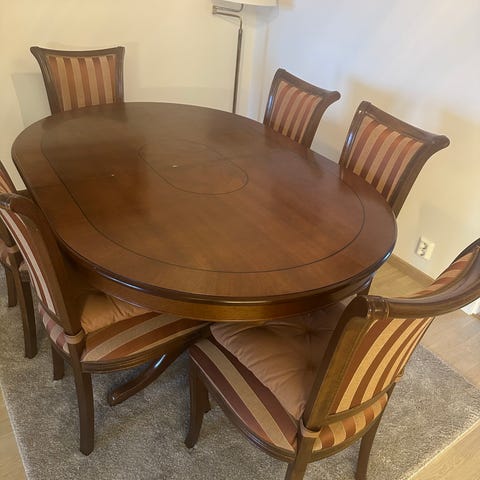 Kirsebærfarget framskap med spisebord og 6 stoler gis bort