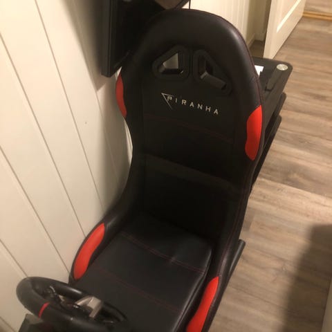 Piranha gamingstol med festeplate, svart med røde detaljer. Stolen har en solid ramme og er designet for bruk ved spill og datamaskin. Festeplaten gjør det mulig å montere utstyr som ratt eller kontrollere. Brukt noen få ganger, gi bud!
