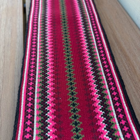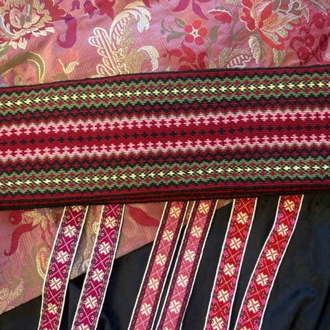 Vakkert belte i rødtoner,burgunder , oker,grønt ,gammelrosa,sort.