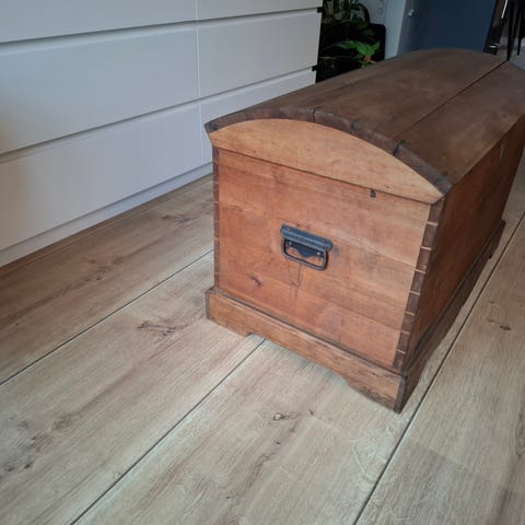 Antikk malt kiste fra 1803 laget i tre med dekorative malte mønstre og nøkkellås. Kisten har et historisk preg med synlige bruksspor og eldet overflate. Egnet som oppbevaringsmøbel eller dekorativt element .Høyde topplokk 61 cm ,lengde 112 cm , bredde 54 cm. Denne sendes ikke må hente eventuelt .