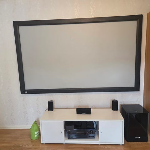 Jeg selger dette flotte hjemmekino anlegget som er omtrent som nytt. Lite brukt. Full HD format og 7.1 surround lyd. Mitsubishi HC3800 projektor med takadapter og Samsung 7.1 blue-ray anlegg for blue-ray disc, hard disk eller Wifi. Prosjektoren kan fint stå på bordet også. Lerret går fra gulv til tak og måler 2,70 m i bredde og 1,6 m i høyden. Lyden er fantastisk og når du sitter 3 - 4 meter fra anlegget er dette samme format som på Colosseum kino i Oslo. Bildene er sylskarpe i 1080p format. Det er mange tilkoblingspunkter bak på projektoren, enten dette er HDMI, coaksial eller data-kabel. Så egner seg veldig godt for gaming også. Alle bruksanvisninger og fjernkontroller følger med som om det var helt nytt. Hele anlegget kostet nytt ca kr 40.000. Tilsvarende anlegg i dag koster opp mot kr 70.000. Jeg selger dette nå for kr 6.000. Anlegget selges da jeg har flyttet til et mindre sted. Kanskje noe for fotball VM også. Du får garantert besøk :-)