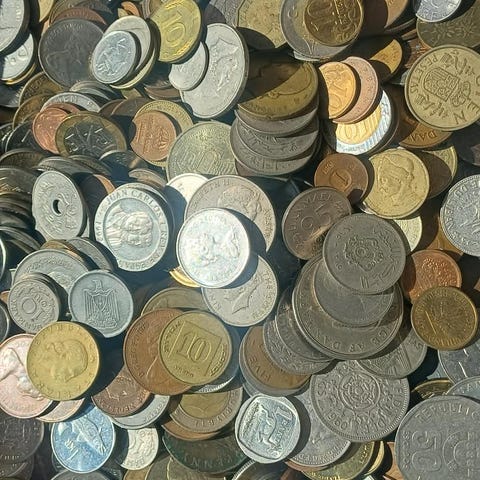 Gamle samlemynter fra hele verden, solgt i totalt 1200 stykker. Jeg kan sende flere bilder hvis du er interessert