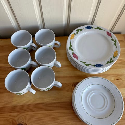 Servise med 4 asjetter, 4 kopper og 3 tefat. Pent brukt. Gis bort mot henting