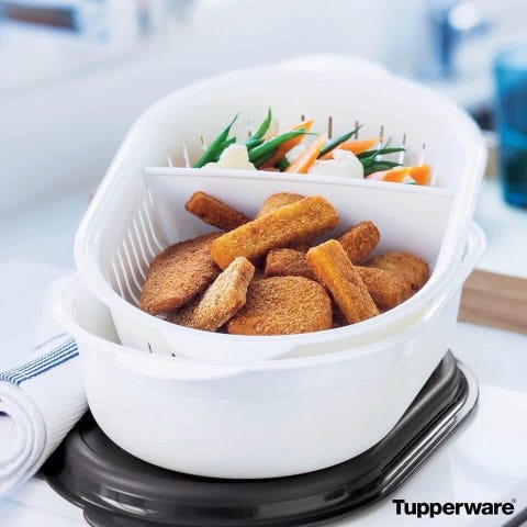Tupperware serveringsfat med fire rom i rød farge. Fatet er designet for servering av ulike typer mat og har en funksjonell inndeling i fire separate seksjoner. Perfekt til taco eller snop