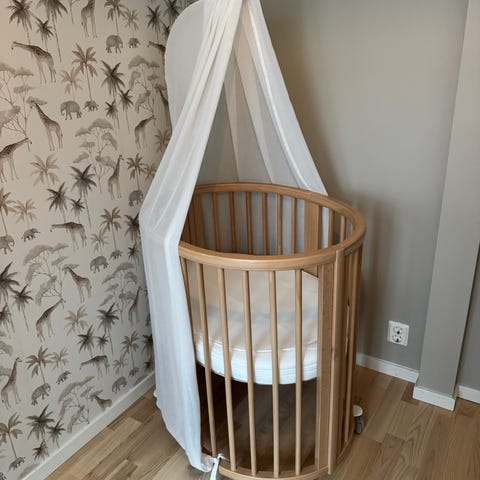 Selger en pent brukt Stokke sleepi mini + stokke sleepi seng i fargen Hazy grey. Sengen er rund/oval med spiler og har hjul for enkel flytting. Bunnen der madrassen ligger oppå kan også justeres i forskjellige høyder.