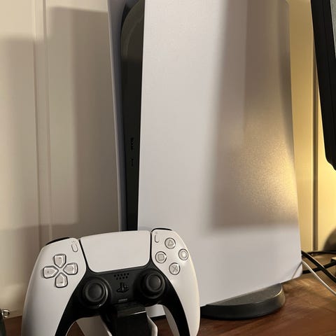 Sony Playstation 5 spillkonsoll i hvit farge. Konsollen har et moderne design med flere tilkoblingsporter inkludert USB. Leveres med en trådløs kontroller i hvit farge. Egnet for hjemmeunderholdning og spillopplevelser.