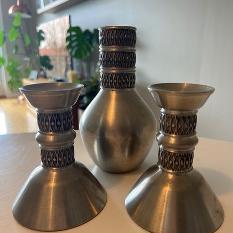 To lysestaker i tinn fra Mustad Pewter, Norway, nr 172 med dekorative detaljer. Lysestakene har en bred base og en smal topp for å holde lys. Passer til standard lys og kan brukes som dekorative elementer i hjemmet.