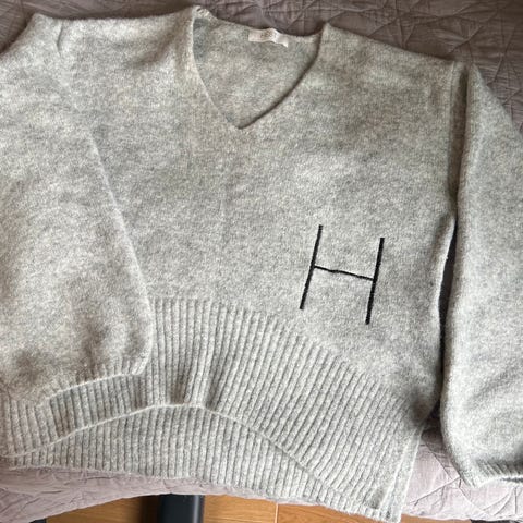 Hést Sofie v-neck genser i fargen summer sand og størrelse xl/2 selges da den ikke blir brukt. Genseren er aldri brukt og lappen henger fortsatt på.