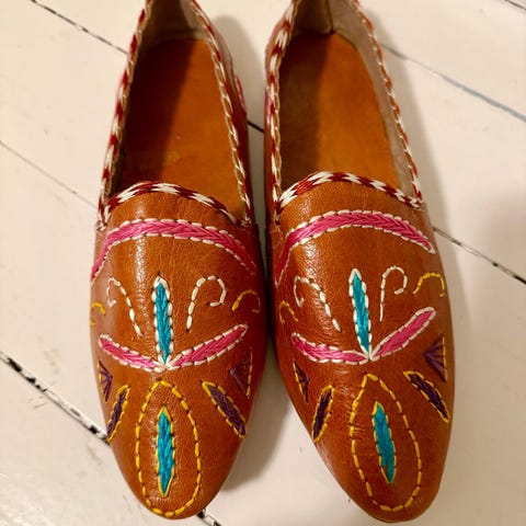 Selger et par helt spesielle slip-on sko i ekte skinn med fargerikt patchwork-design 🌈