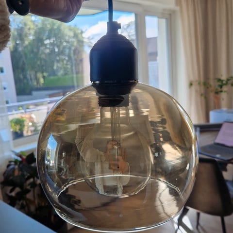 Pen taklampe i glass, tre og metall. Lyspære følger med.