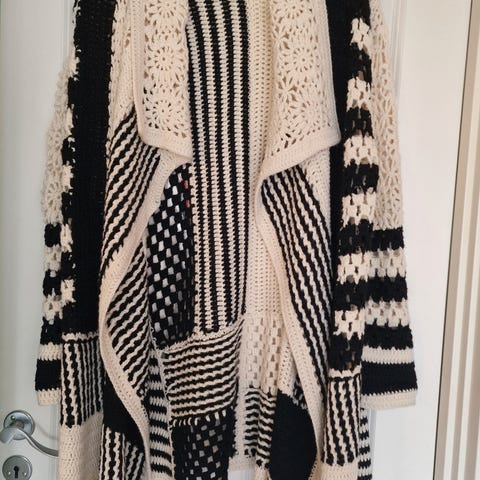 Sjarmerende heklet cardigan i kremhvit bomull med lilla broderte blomster. Kort modell med V-hals og knappelukking. Korte ermer i lett, strukturert stoff som gir et feminint og sommerlig uttrykk.