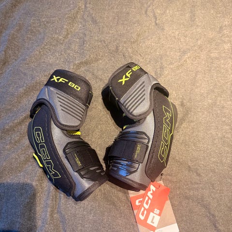 CCM FT680 ishockeybeskyttere i størrelse Junior Medium. Designet for ishockey med beskyttende polstring og justerbare stropper for god passform.