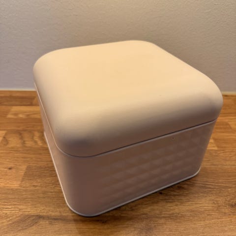 Hull på sidene gjør boksen enkel å løfte og flytte. Lokket sitter godt og gir et ryddig uttrykk.