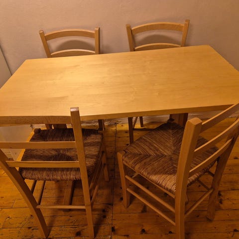 Selger et ovalt spisebord str 100x160. Perfekt til 6 personer. Bordplaten er malt. Slitt og merker. Blir fint igjen med et nytt malingstrøk. Stålfargede ben. Må hentes.