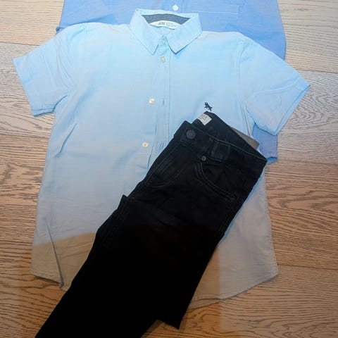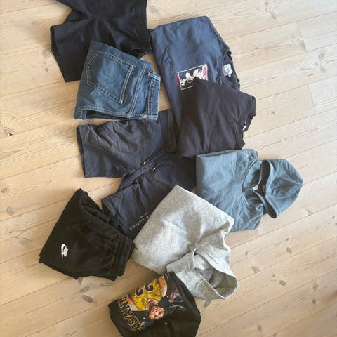 Klærne er pent brukt og ingen hull/merker er oppdaget (bortsett fra den lille grønne flekken på hettegenserne - se bilde). Vanlig bruksslitasje må påregnes.