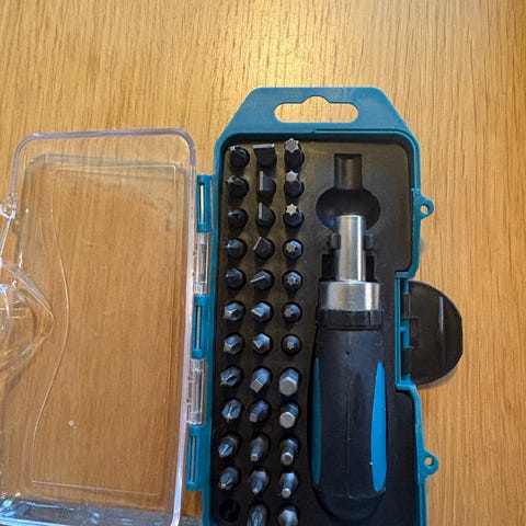 Unbranded skrutrekker med 71 deler bits sett. Inkluderer et håndtak og et utvalg av bits i forskjellige størrelser og typer, pakket i en gjennomsiktig plastboks for organisering og oppbevaring.