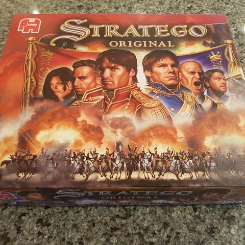 Stratego Original brettspill med brett, brikker i to farger (rød og blå), og instruksjonshefte. Brettspillet inneholder 40 brikker per farge, med tema basert på strategisk kamp og er egnet for to spillere.