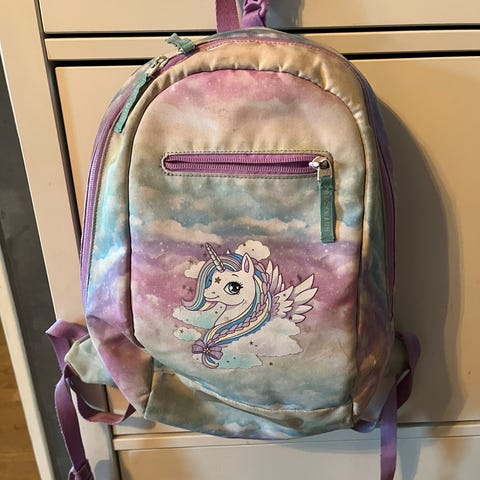 Fin som barnehagesekk. Kan hektes på skolesekk.