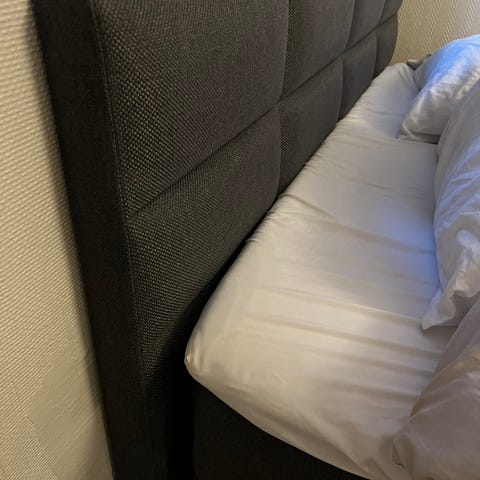 Jensen kontinental seng med puls madrass i hvitt og beige trekk. Madrassen er designet for å gi komfort og støtte. Den har et tekstil som er sertifisert i henhold til Oeko-Tex Standard 100, noe som indikerer at den er testet for skadelige stoffer. I god stand, følger med overmadrass om ønskelig. Har vært madrasstrekk på den hele tiden under bruk i tillegg til laken.