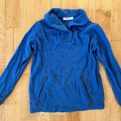 WoolLand ullgenser for jente i størrelse 122. Genseren er laget av ull og har en rosa farge. Den har dekorative detaljer som en hvit vingeapplikasjon på brystet og en knapp i nakken for enkel påkledning.