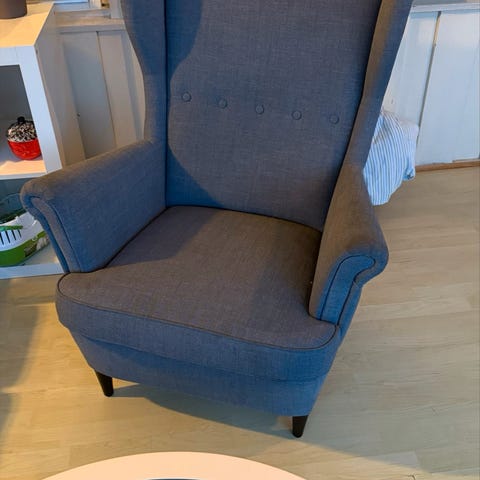 Pent brukt stol med fotskammel, til salgs. Ikea Strandmon.