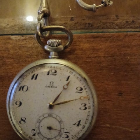 Lommeur med kjede . Urskive med arabiske tall og sekundviser. Deksel med dekorativt mønster. Mekanisk oppheng for kjede.