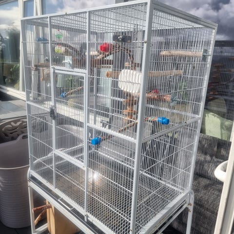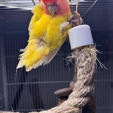 En kasse med papegøye leker , noen noe brukt og noen nesten ikke brukt , Plastikk , metall, og tre. Noen sittepinne av gummi og slipe sten. En sittepinn til dusj.