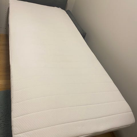 IKEA voksesengi blå farge. Sengen har en enkel design med sengehester på begge sider, og kan strekkes ut fra 120 cm til 175 cm i lengde. Sengen er tilpasset barn og har en robust konstruksjon. Noen bruksspor og mindre slitasje er synlig på rammen. Madrassene har noen flekker (ikke urin) men med en overmadrass blir man kvitt det problemet.