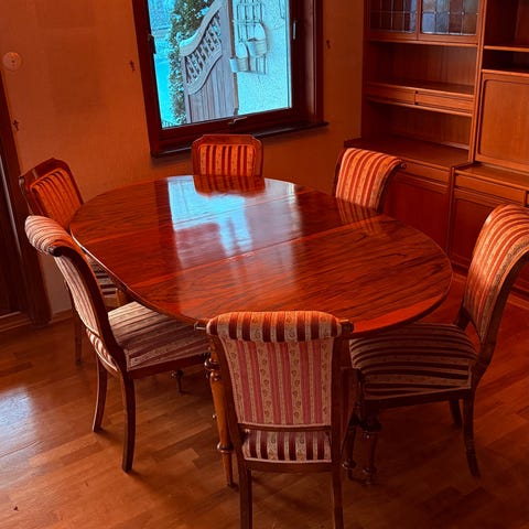 Hei selger en spisebord med stoler..bordet er trekkbard som gjør at den blir store..ta kontakt på tlf nr 99575824