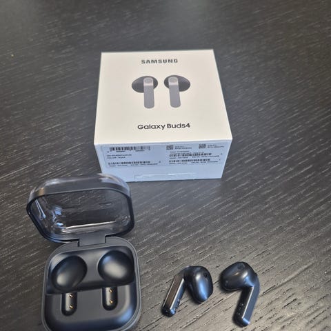 Samsung Galaxy Buds 3 trådløse hodetelefoner i svart. Inkluderer ladeetui og to separate ørepropper.